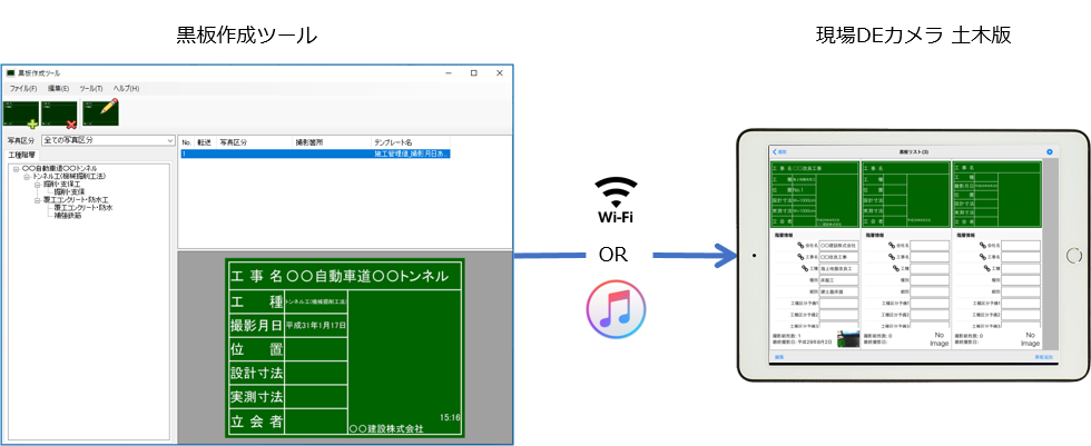 作成した電子小黒板を「現場DEカメラ 土木版」に転送できます。 ※「現場DEカメラ 土木版」は無料アプリです。 事前に作成した電子小黒板を、現場DEカメラ 土木版に取り込んで工事写真が撮影できます。 黒板に設定した情報は写真情報に連携しているため、効率的な写真管理が可能です。 Wi-FiまたはiTunesを使用して現場DEカメラ 土木版へ転送できます。